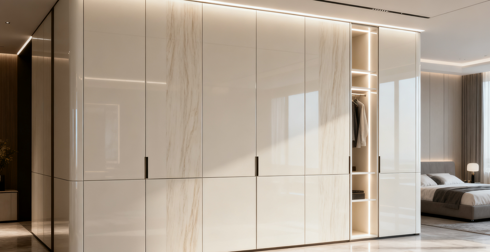 Choose your panel finish, interior layout (shelves/hanging/ drawers), lighting options, and size. OPPEIN provides global custom service. Request a quote to tailor to your space.
