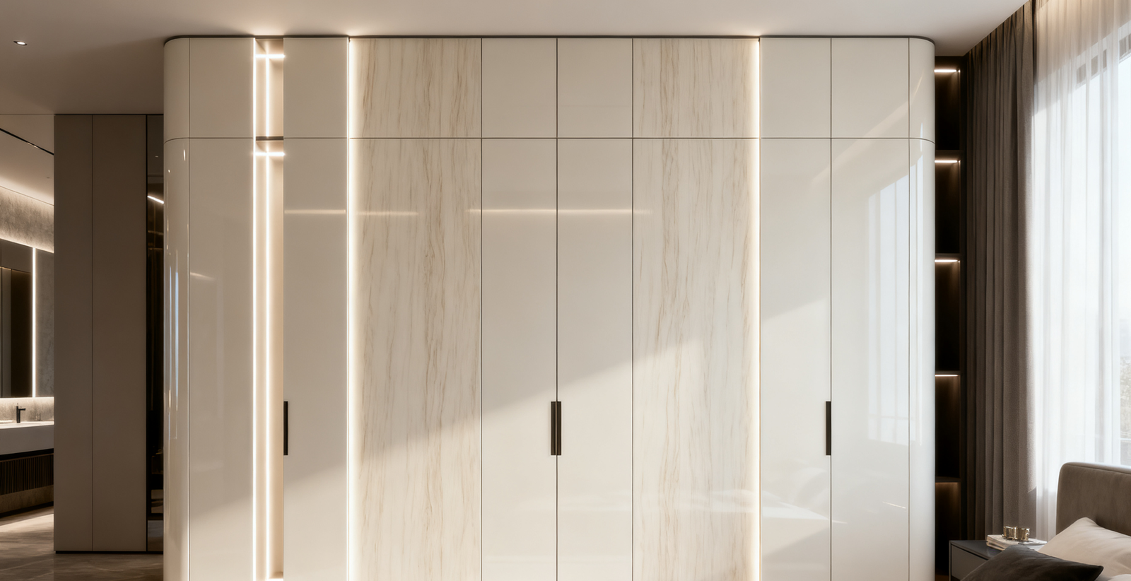 Elevate your bedroom with the Modern Handleless Wardrobe. Designed with off-white panels paired with light wood accents, this wardrobe blends contemporary elegance with functional storage. The handleless design ensures a clean, minimal aesthetic, while open shelving, glass panels, and interior lighting provide both style and practicality.