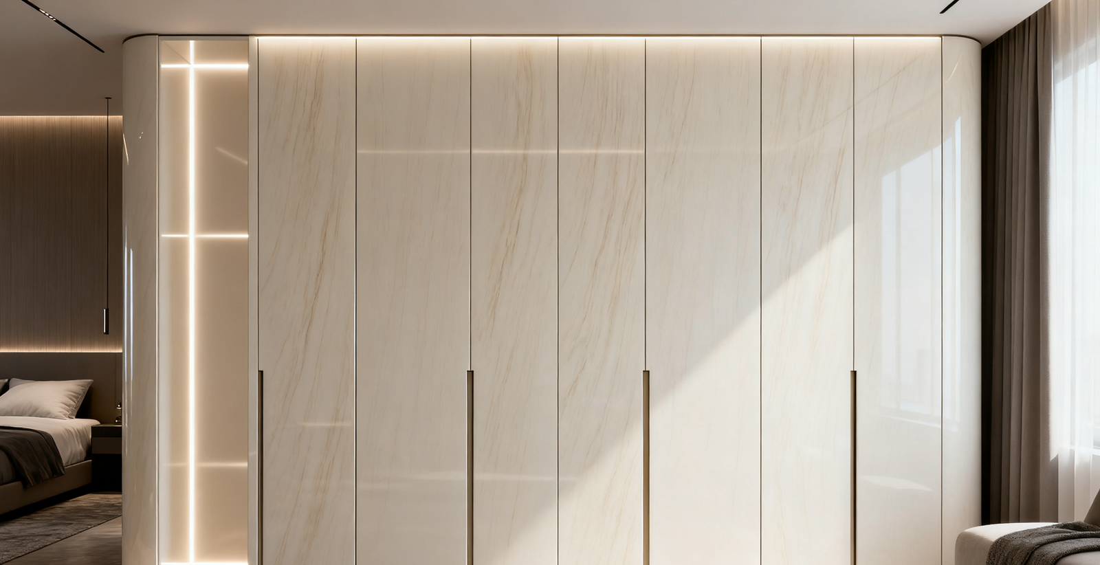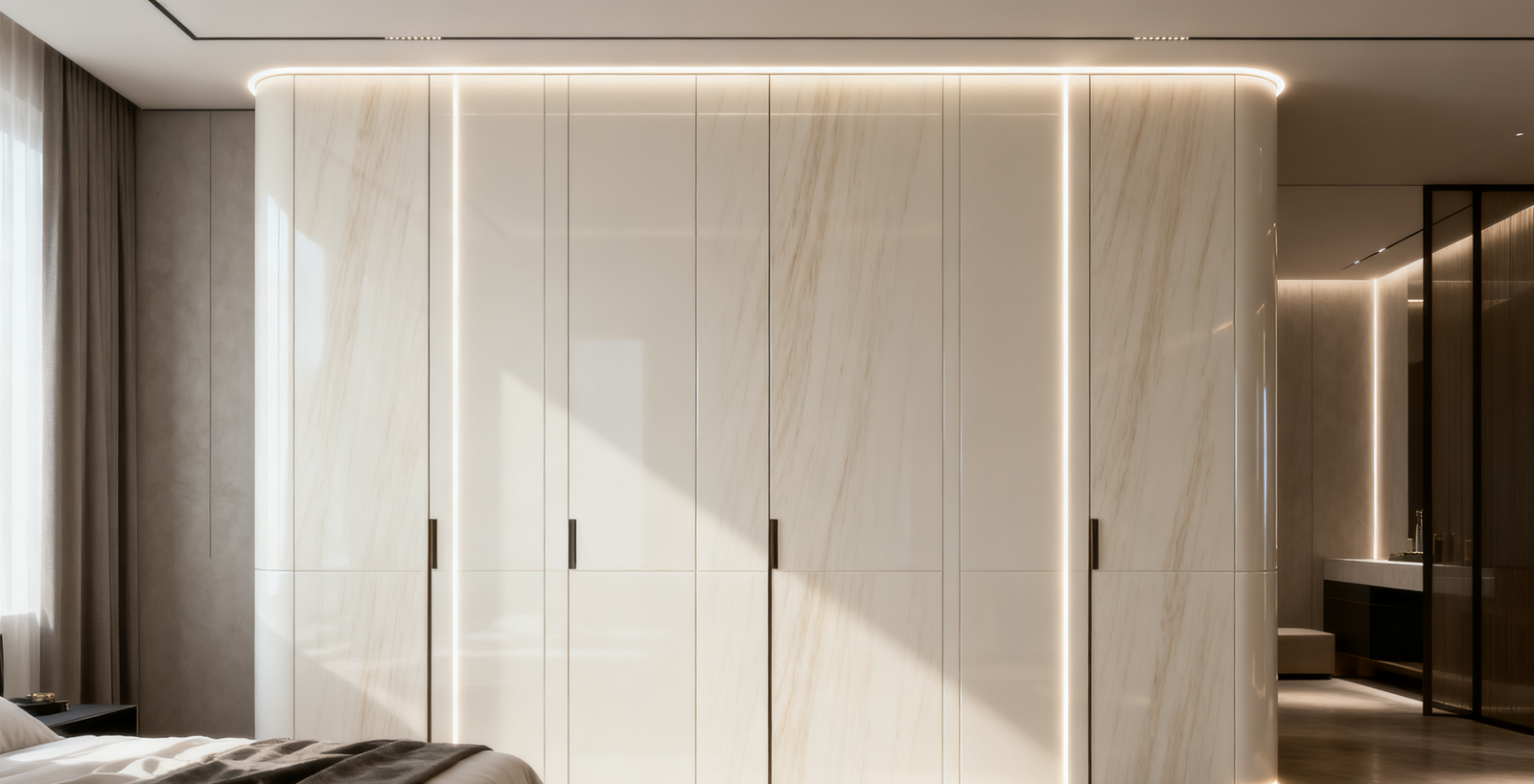 Modern handleless off-white wardrobe with light wood accents — sleek panel design, open storage, customizable interior. Free quote available.