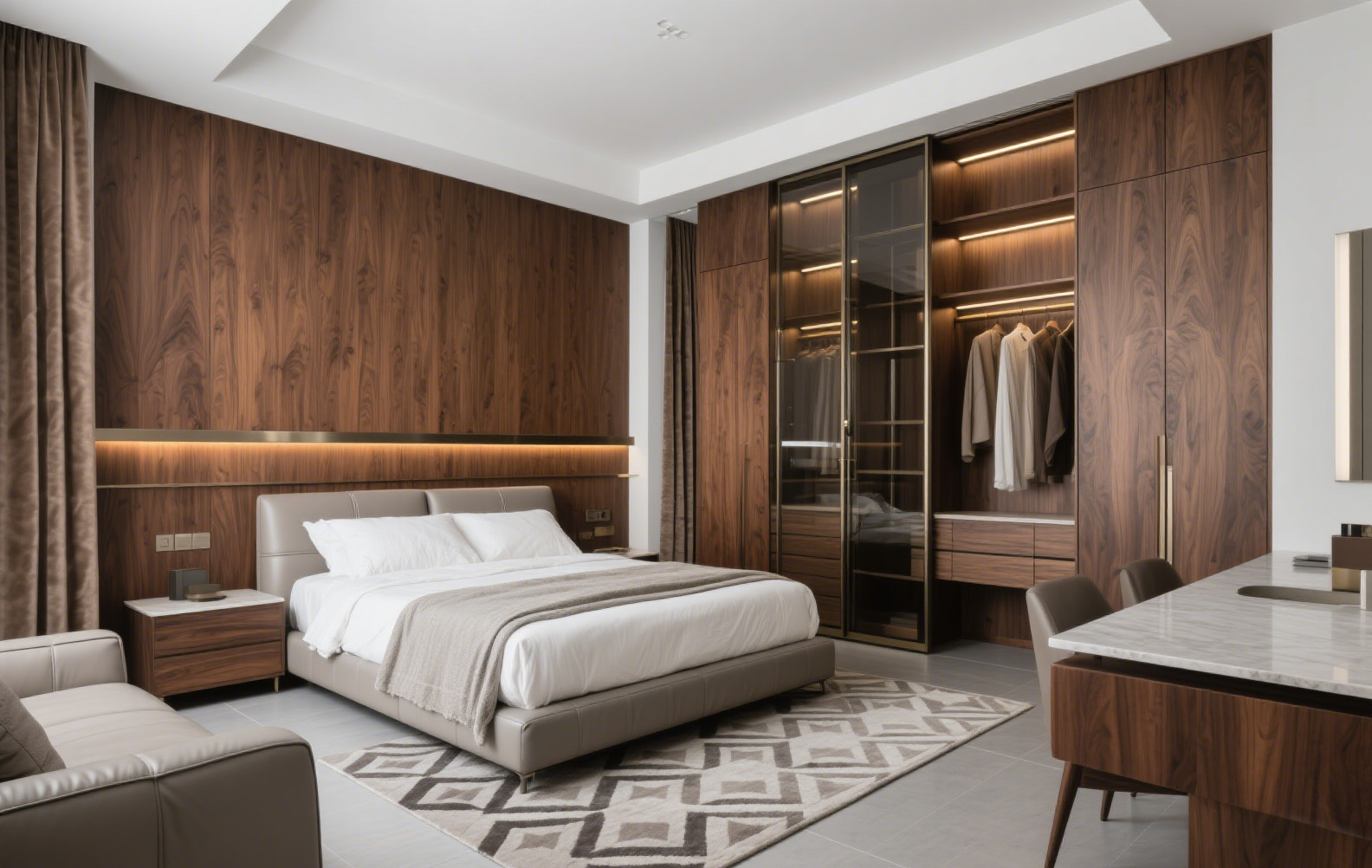 Premium materials: walnut veneer, light oak finishes, and elegant sintered stone surfaces.