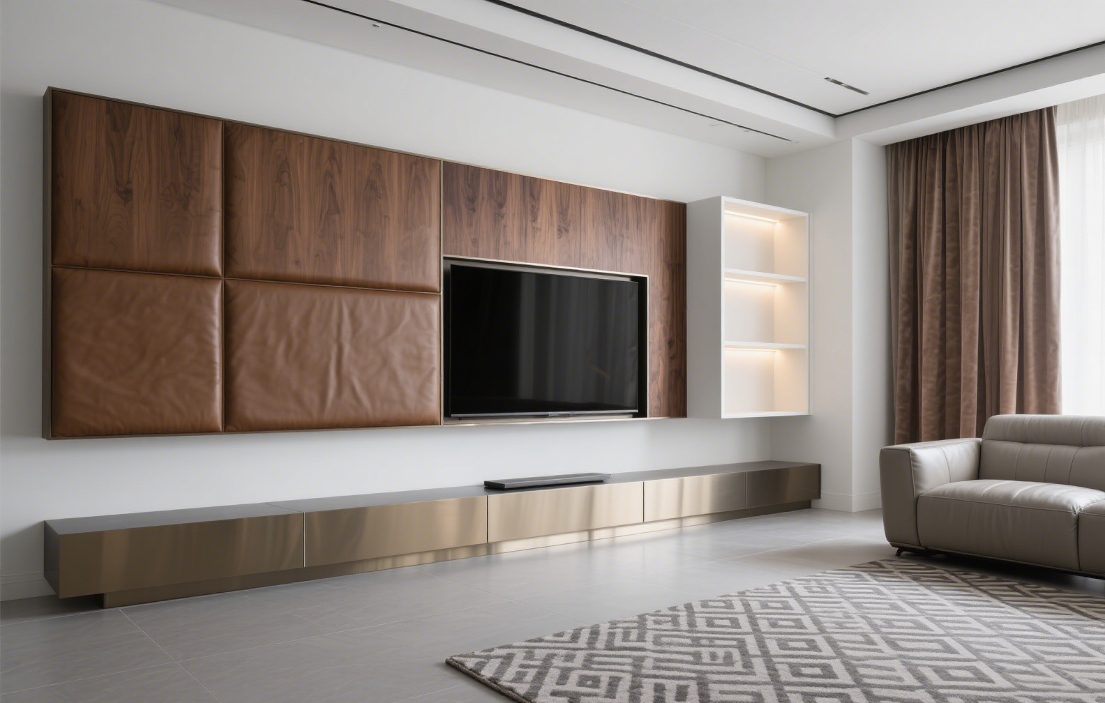 Sleek aesthetics: integrated aluminum handles, open shelving with ambient lighting, and minimalist cabinetry.