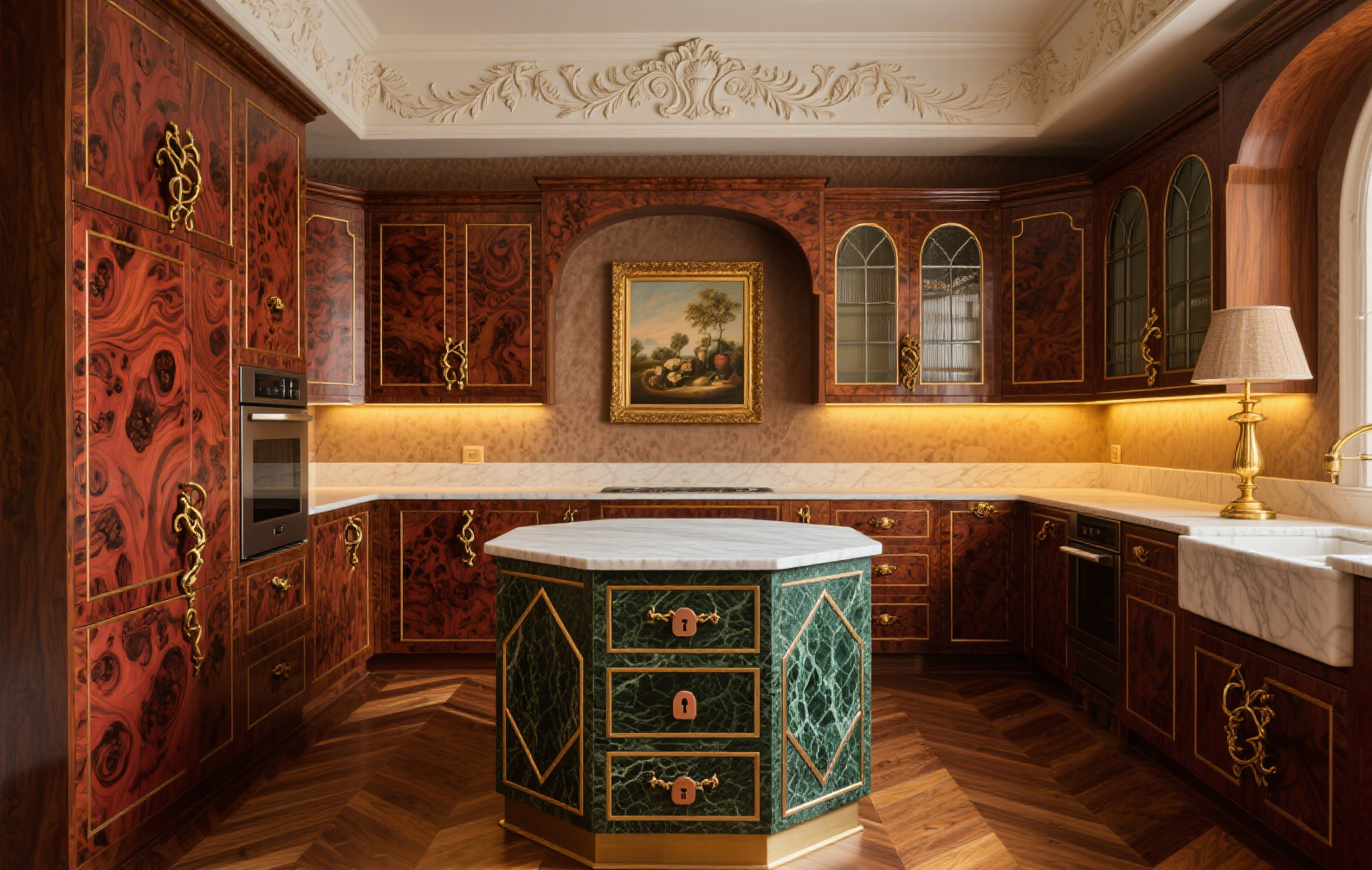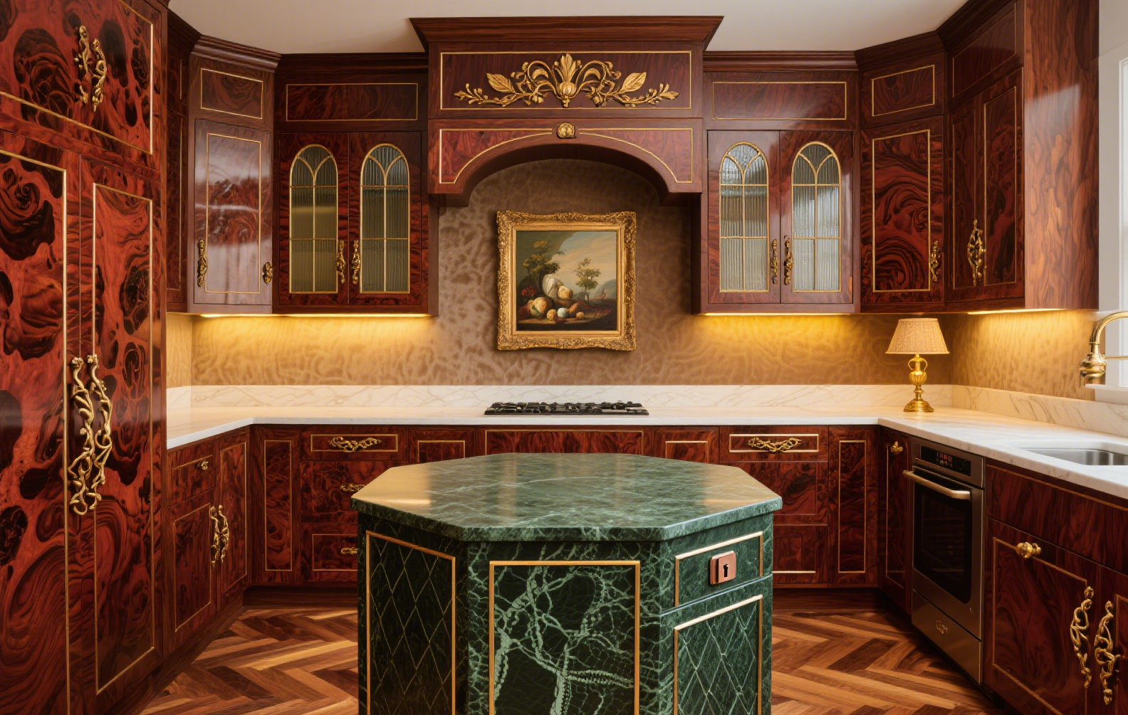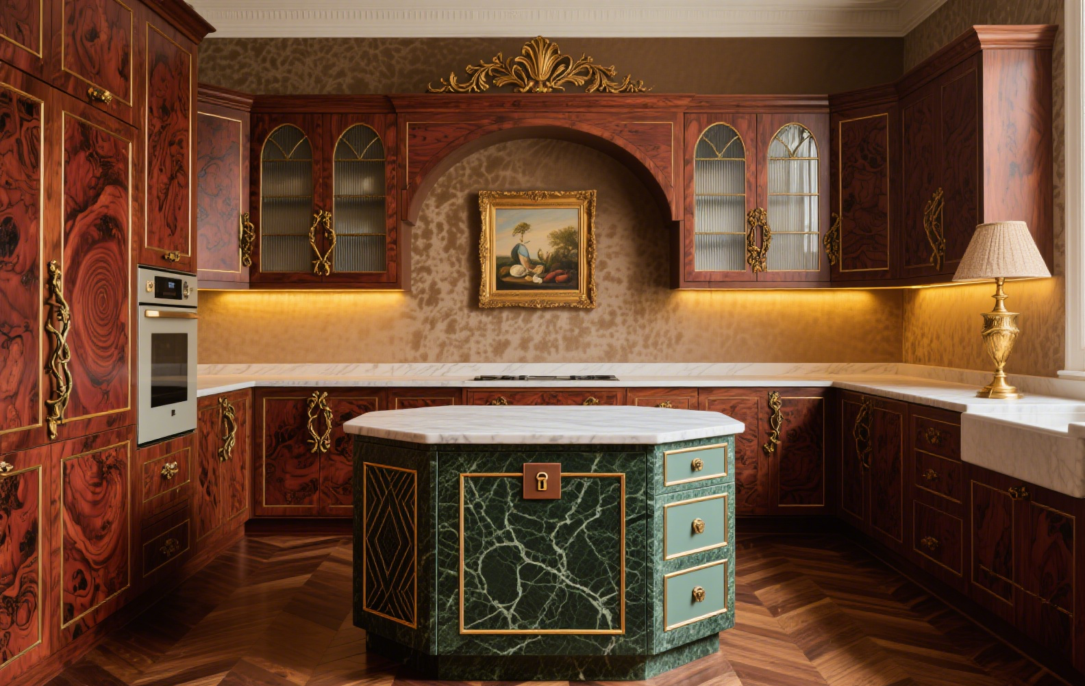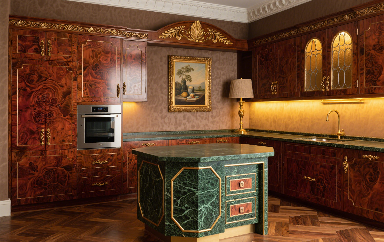 A nostalgic, medieval-inspired luxury kitchen crafted with rare veneer, glass elements, and stone accents—offering elegance and modern functionality.